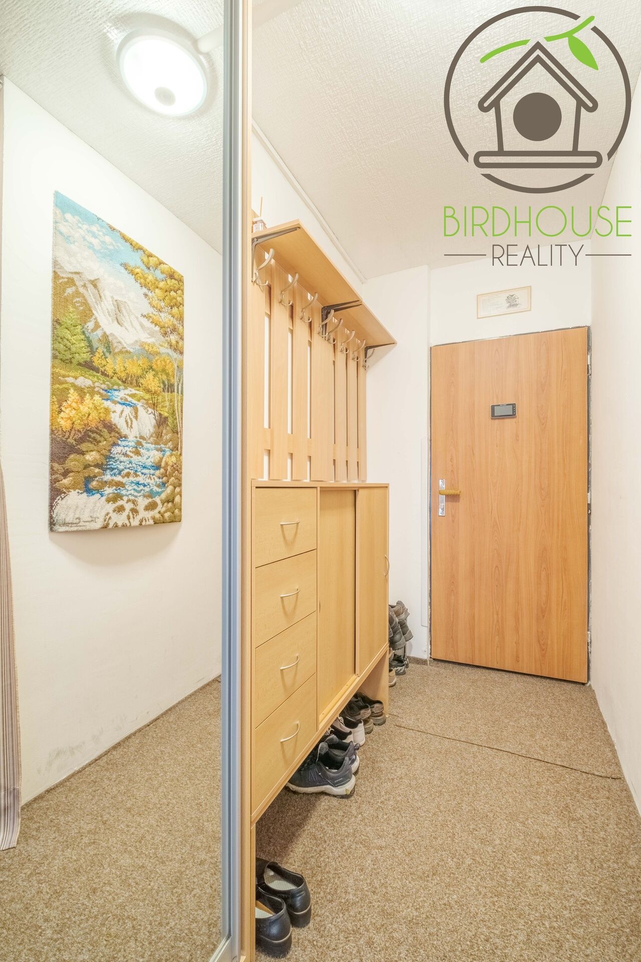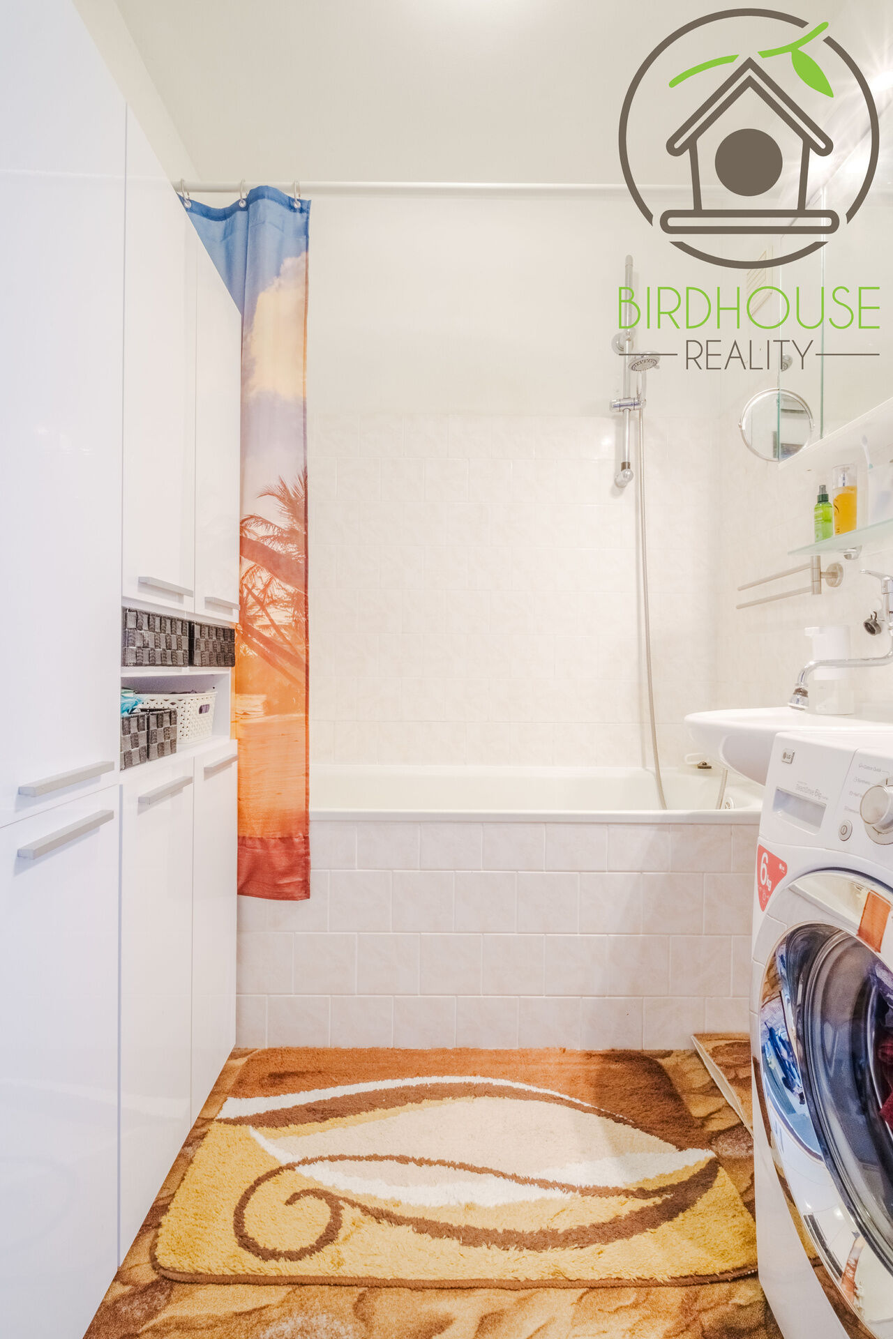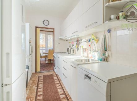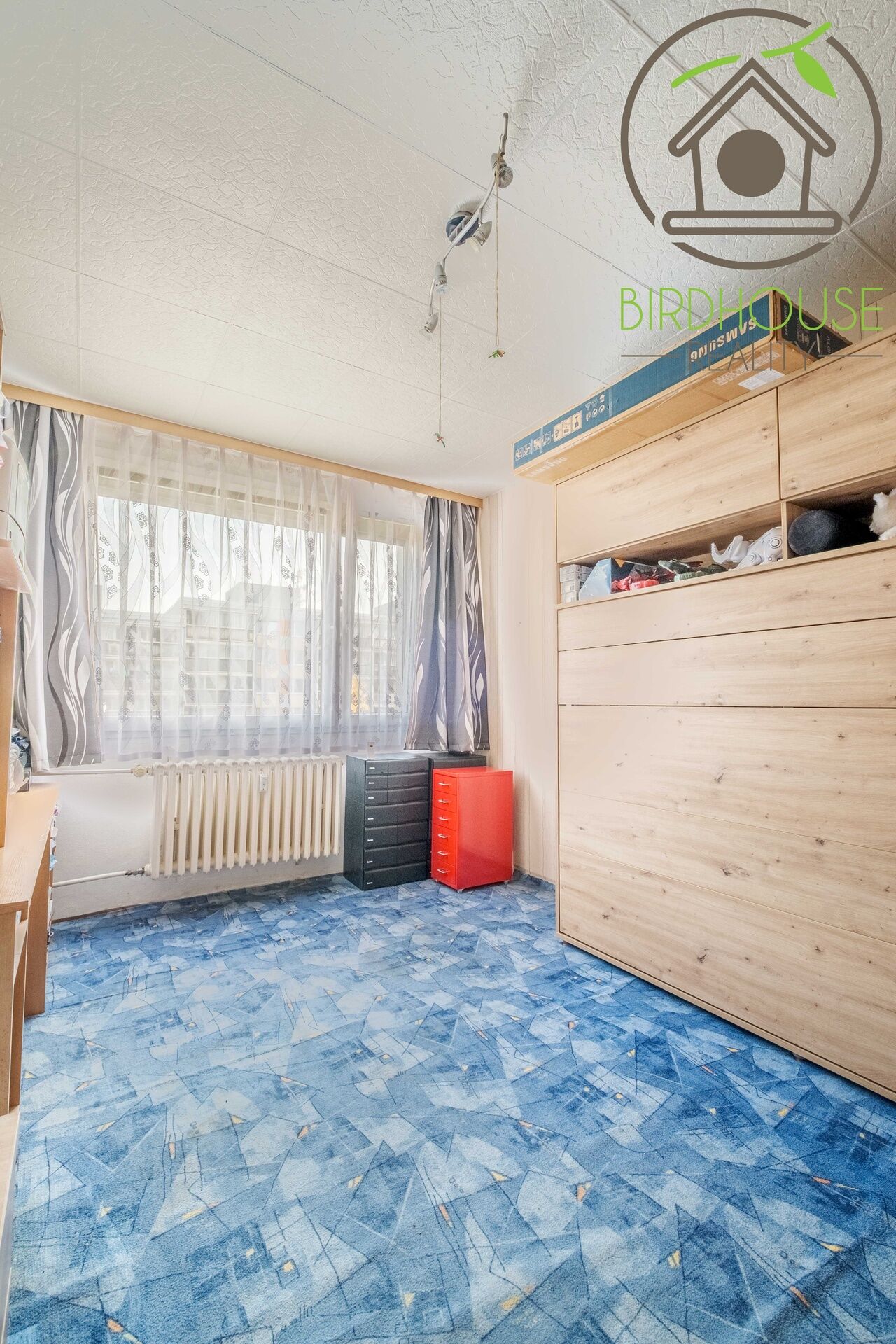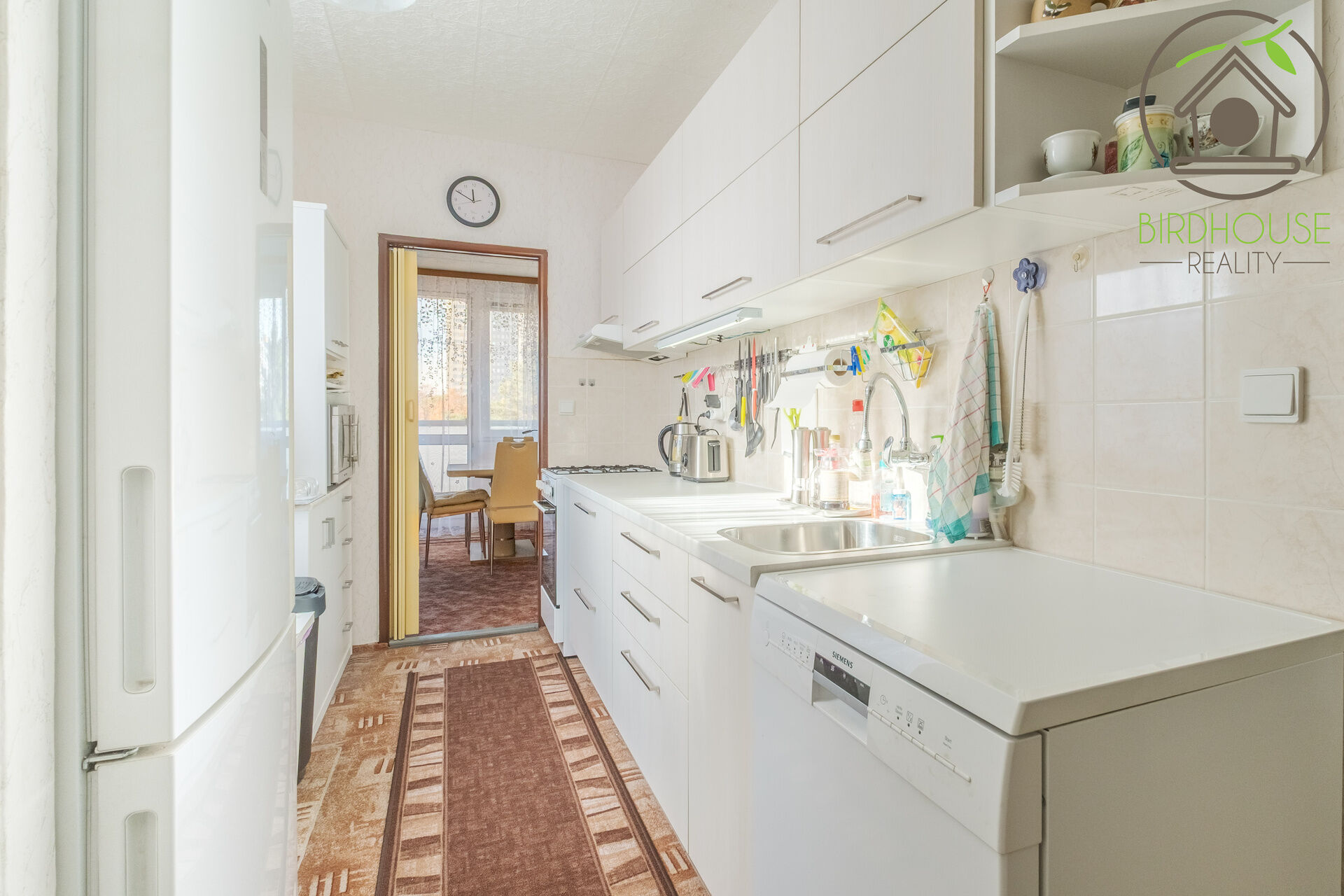 Obývací pokoj (21,1 m²) poskytuje dostatek prostoru pro sezení i jídelní kout a nabízí přímý vstup na prostornou lodžii (6,9 m²), která je ideální pro odpočinek. Kuchyně (8,54 m²) je vybavena kuchyňskou linkou ve velmi dobrém stavu. Dva samostatné pokoje (12,2 m² a 13,5 m²) lze využít jako ložnici a dětský pokoj, případně pracovnu. Všechny pokoje jsou vybavené praktickými předokenními roletami, které zajišťují soukromí.